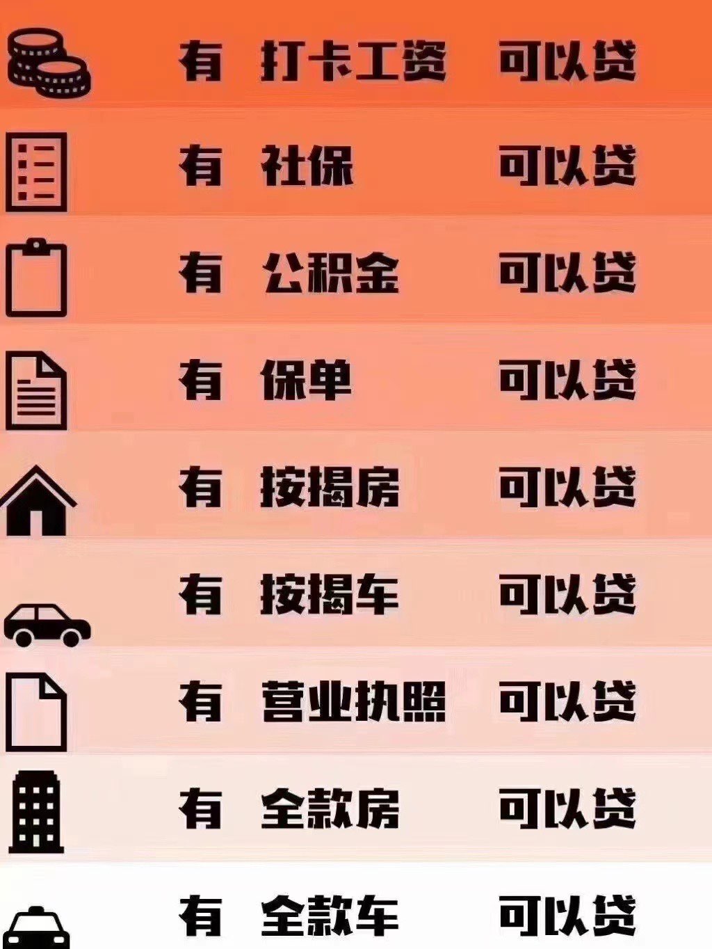 4:个人信用贷款(有打卡工资,社保,公积金,保单,营业执照,名下有房车按揭,个人流水贷)