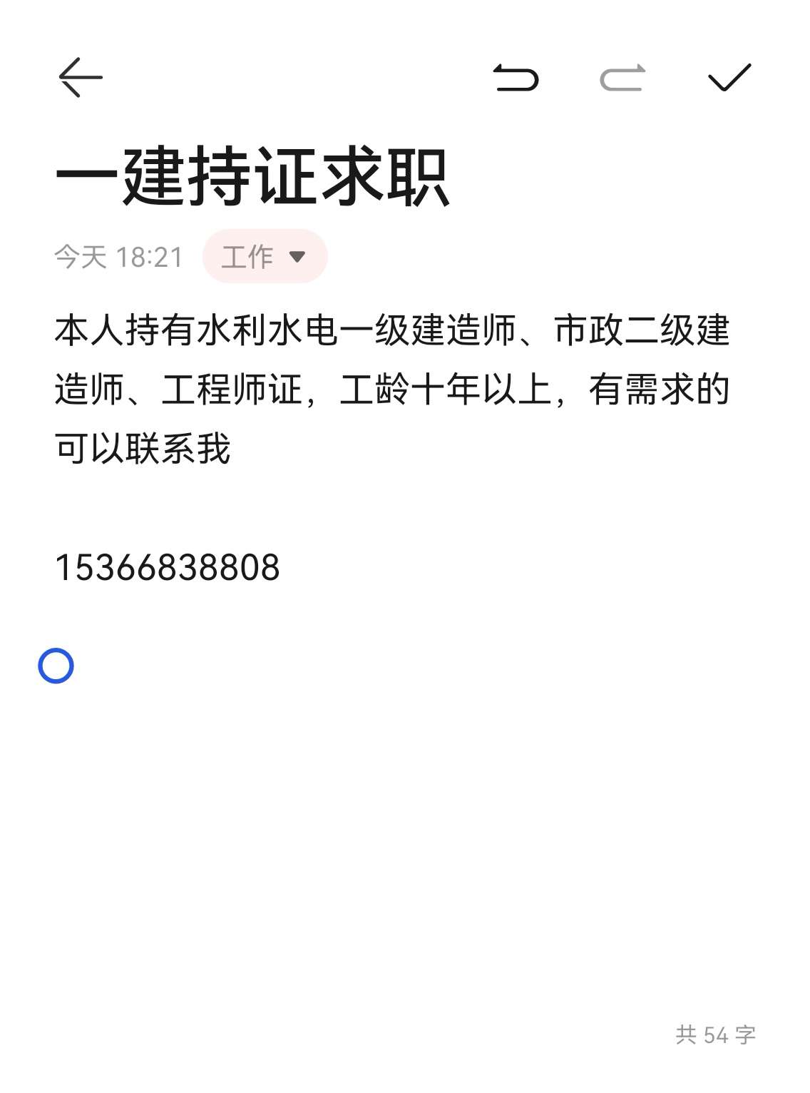 本人持有水利水电一级建造师证,现找工作单位求职