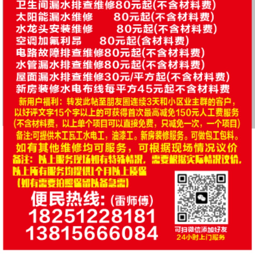 家里漏水的请注意了,您附近的防水补漏专家/提供免费上门勘察啦136852845685小时前 6305浏览房屋维修