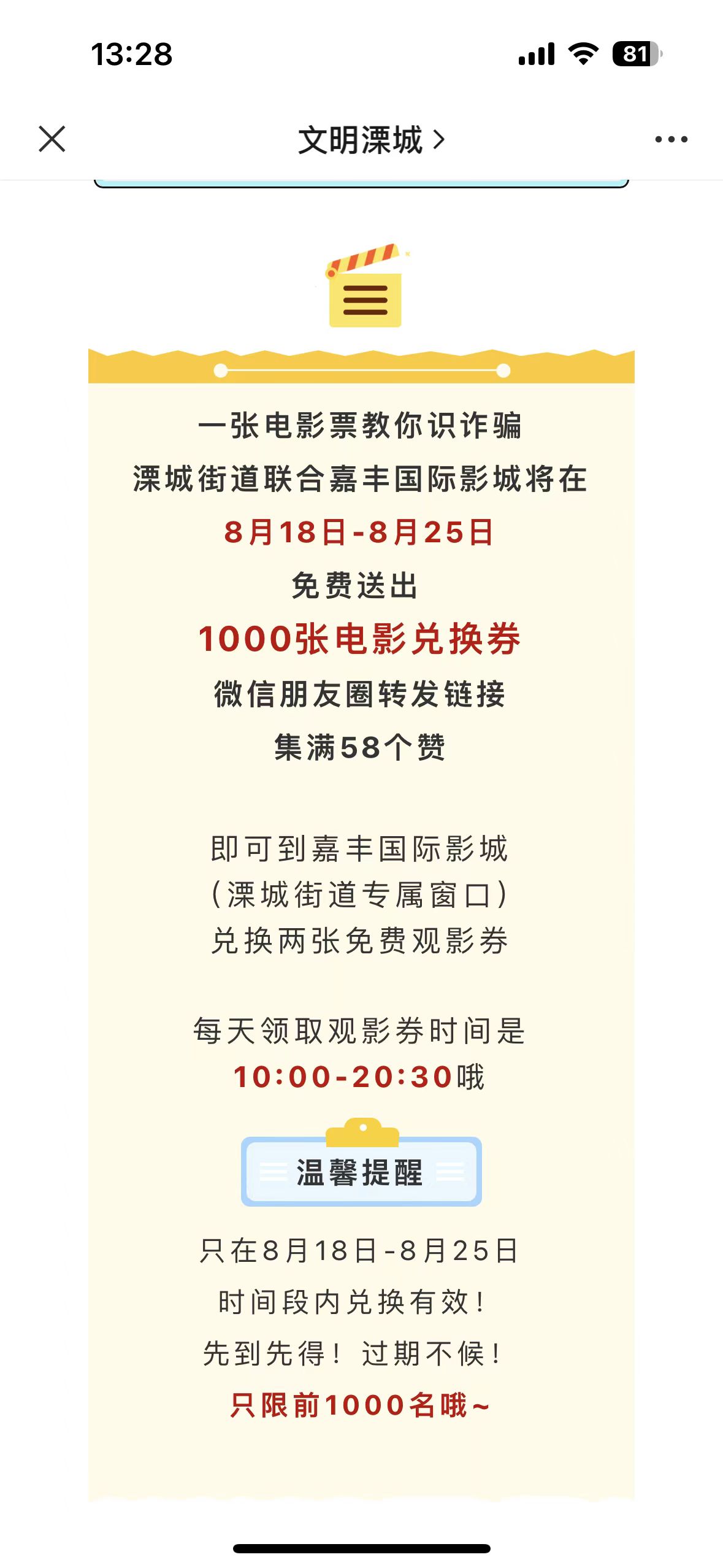 真的很生气,在朋友圈看见这条链接,说是积满58个赞就可以换取两张电影票,并且表明积赞的期间限制是从8月18号到8月25号,可是当我们积攒完58个赞时才21号,我们从天目湖赶来时,售票员表示票已经售光,可明明才21号,且两位售票员态度极差,真的是为什么售光了不说一声呢,我们大老远过来只换来他们态度极差的售完了,想必但凡是站在我们角度的都会觉得无语和生气的,属于欺骗行为,希望大家避雷这家影城。