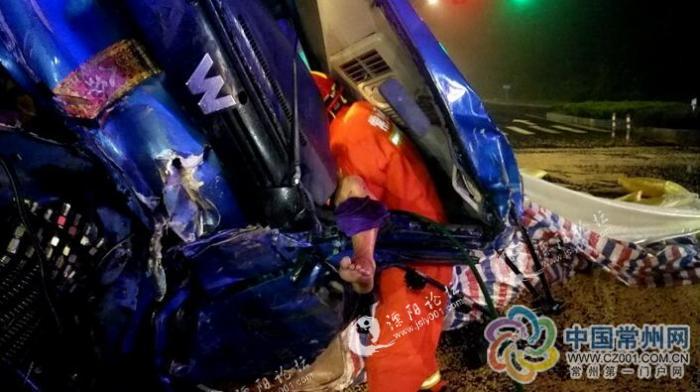 6月30日03时25分,溧阳市城东大道与腾飞路路口处,一辆货车侧翻在了道路上,造成驾驶员被困。
