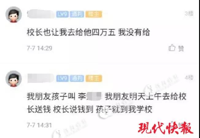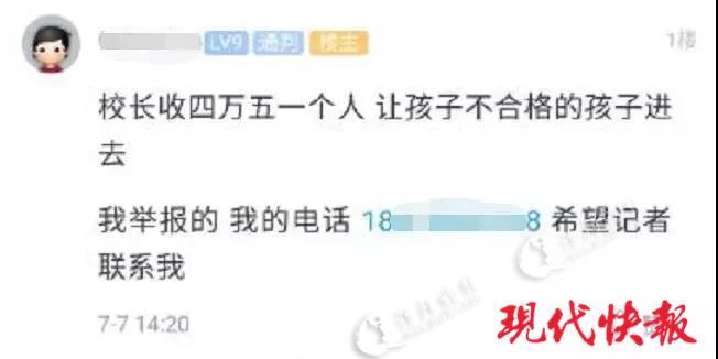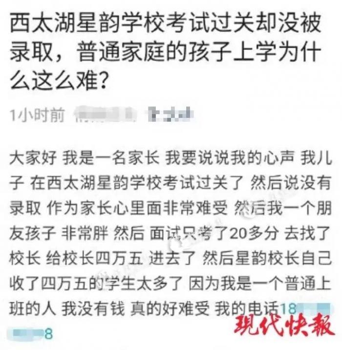 记者注意到,在爆料贴中,那位网友自称是学生家长,自己的儿子去参加星韵学校的面试,但没有被录取,心里很难过。而自己朋友的孩子,面试才20多分,但因为找了校长,给了四五万,朋友的孩子就录取了。其网帖上还称,校长也让他送钱,但他没有送。“我朋友明天上午去给校长送钱,校长说钱到,孩子就到我学校”。网帖上,这个举报的家长还写了一串手机号码,让人感觉是实名举报。
