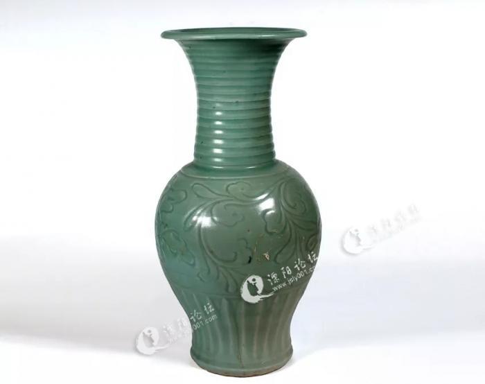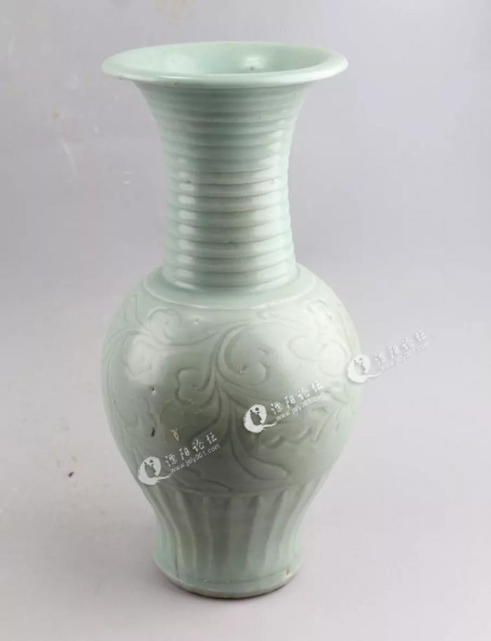 这是一件溧阳市博物馆馆藏元代龙泉窑花卉纹凤尾尊,凤尾尊高42厘米,釉色温润光泽,长颈圆腹,口沿下修数圈弦纹,腹部通体凸刻花卉纹,纹饰刻划繁而不乱,腹下近足处施细长菊瓣纹。整体造型端庄典雅,体现了元代龙泉窑大气浑厚的特点。