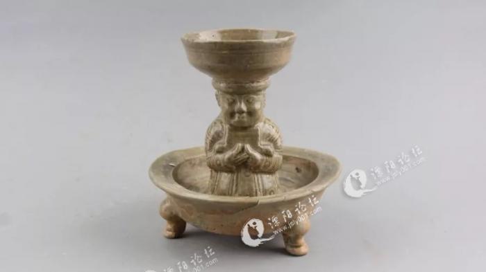 这件越窑青瓷灯台造型颇具创意,人物具有强烈写实意味,体现了魏晋六朝时期士族阶级的生活情趣。以人俑作灯柱在同时代的灯具中较为少见,《中国陶瓷全集·三国两晋南北朝》中收录一件浙江余杭出土的相类似器物。