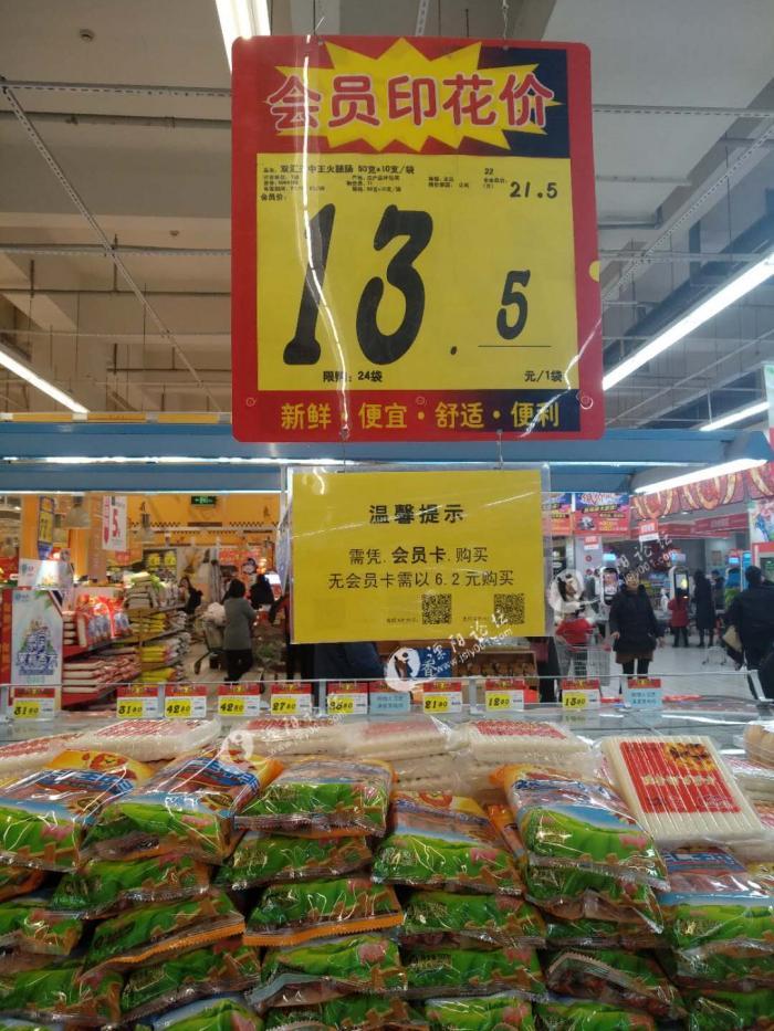 新年来临,要开始为新年做一些准备,这不趁着有低价风暴的活动去到了溧阳大润发想看看有什么东西可以准备准备,大润发里面购物为新年做准备的人还不少,好多商品都是标着会员价和非会员价,正好看到王中王,刚想买就看到上面写着13.5下面有一个温馨提示,需凭会员卡购买,无会员卡6.2购买,非会员价比会员价还低,这是挂错了吗,莫名好笑。