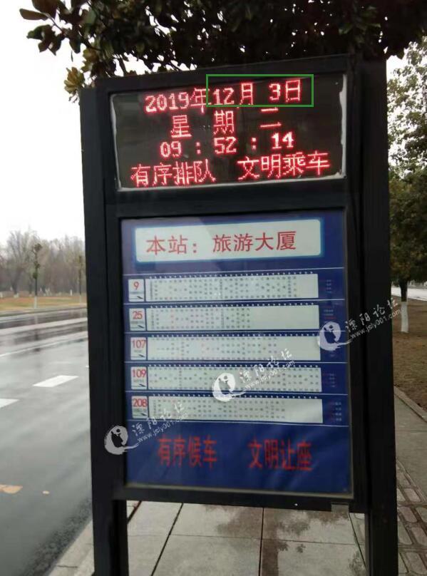 这两天溧阳一直下雨,大家出行都不是很方便,坐公交车的人更加多了。早上在旅游大厦站台那等车的时候,发现站台显示屏上的时间居然还停留在2019年12月3日,现在明明都2020年了好吗?我记得之前好像论坛上也有网友发过类似的问题,没想到现在又出现了这种情况,这不是误导人家吗?希望公交公司及时去现场维修整改一下!