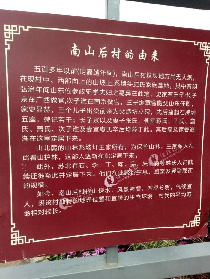 汽车东行,沿着1号公路,先到白云鹿场丶白云茶场转了转。到了山北麓的‘’南山后村‘’,这里是溧阳上黄镇新农村的典型村落,村庄不大,在山脚下北面,1号公路贯穿村子,村头的小广场牌子上写着南山后村的由来,广场墙壁上挂有十几块各个单位的实习基地,文化氛围浓厚。村庄的面貌很漂亮,仿明清徽派建筑式样,一律白墙黑瓦翘飞檐,整齐划一。据说,在山脚下还有两座古时的坟墓,后人石彻保护的很好。山下的小河蜿蜒盘行在山脚下,大概是古时长荡湖的水,流经了山腹地,使之山川锦绣,百姓物丰,山才有了文人雅士的灵感与赞美,才有了传说中的‘’东坡八景‘’,与相关诗词文章留传后世,才有了王、石、李、蒋姓氏等的繁衍生息,开枝散叶。这条小河或许就是山人民的母亲河吧。路两边的樟树叶在阳光下更显鲜亮碧绿,小广场旁的石竹花灿烂可爱,山野的风吹来很是舒爽,好像氧离子特别充足,让人精神清明。陶渊明若天上有知: