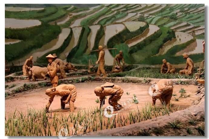 有些地方,为了纪念农民不辞辛苦,齐心协力插秧的画面,用泥巴塑造还原当时场景,存放进了风俗博物馆。