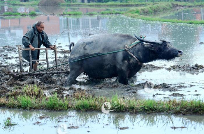 走在队伍前面的人左手牵牛,右手悬筐。旁边还有一个人扛着犁架,亦步亦趋。后面紧紧跟随的众人,有的提着热水壶、瓷缸,有的挑着竹编的秧篮,有的拿着拔秧凳,一起前往秧田。