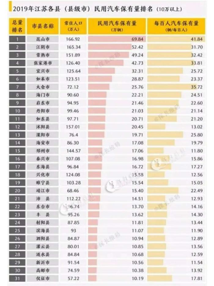 民用汽车保有量方面,苏州四虎(昆山、常熟、张家港、太仓)与无锡二强(江阴、宜兴)以及如皋、海门、启东、丹阳列榜单前十。