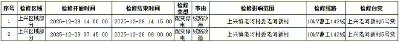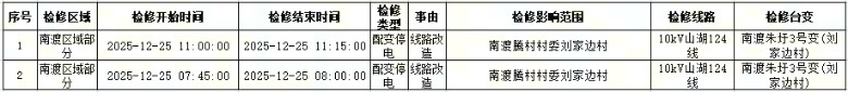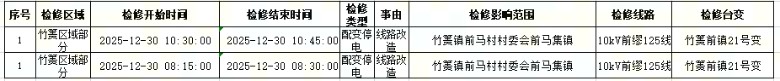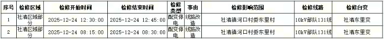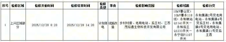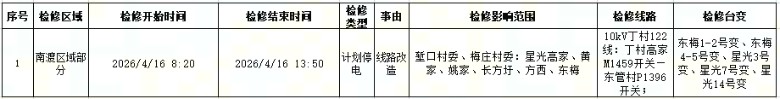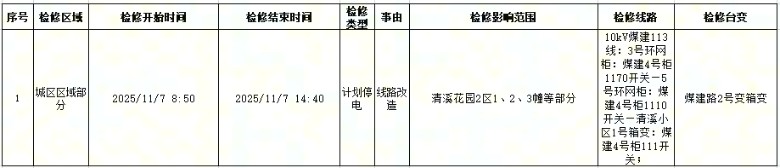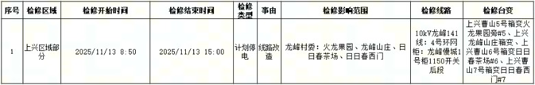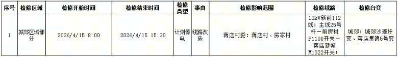 尊敬的客户,检修期间供电将会暂时中断,由此带来的不便,敬请谅解,本区域电网检修信息如下: