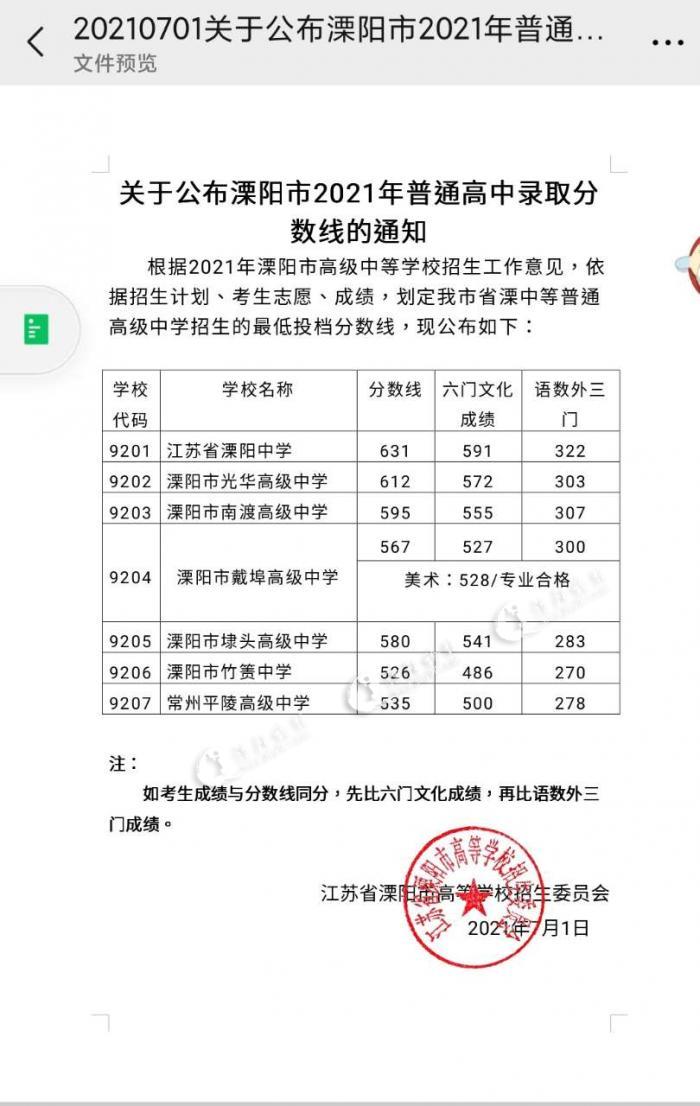 关于公布溧阳市2021年普通高中录取分数线的通知
