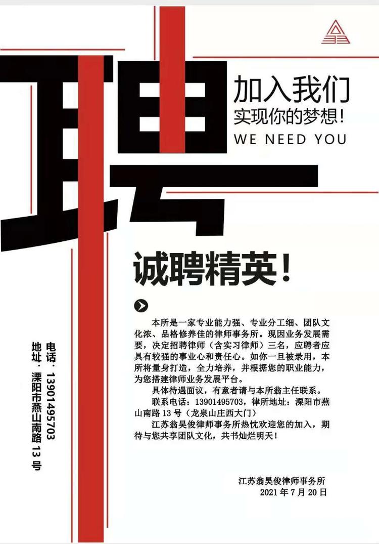 | 招聘职位: | 江苏翁昊俊律师事务所招聘内勤、律师助理、律师、实习律师 |