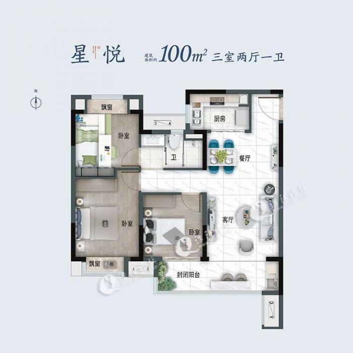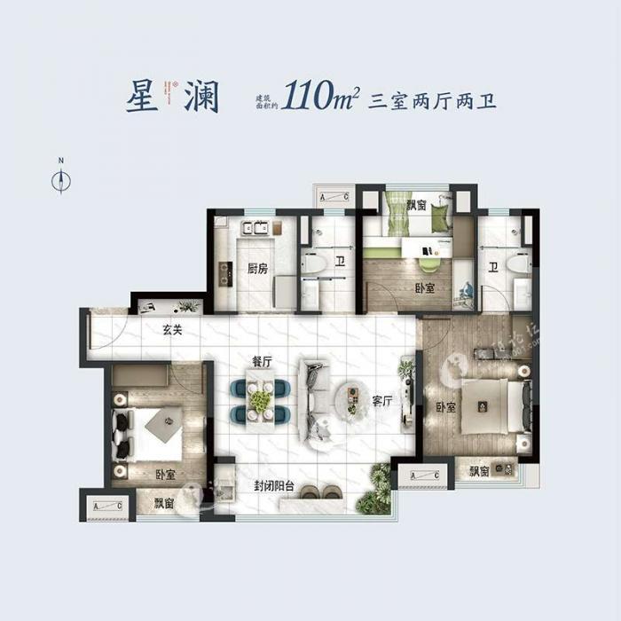 110平,3-2-2型,横厅双阳台,独立单元私密舒适,南北通透!