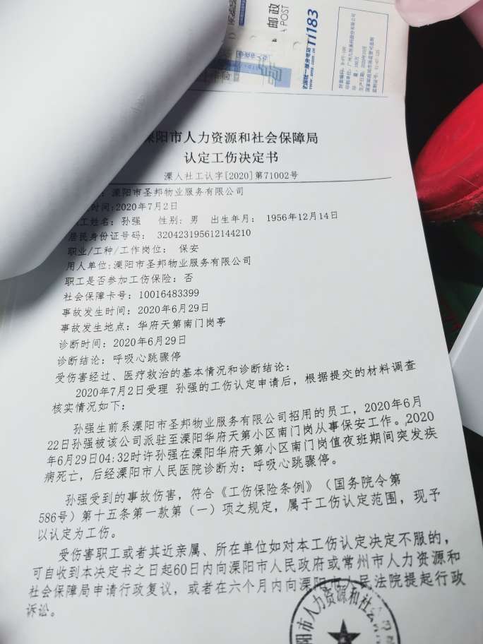 并且期间无任何人来巡逻,导致意外的发生。(此物业保安白班转晚班不合理,他们是白天上完白班,下午三点回去睡觉,然后晚上十点接着上晚班)事发后,物业老板童瑛,至始至终都未出面出来协商此事,连句问候的话都没,只是叫手下人来传达,一切走法律程序,如果工伤认定工亡,再多钱也照赔,可是等我们拿到工亡认定书的时候,她又耍赖,说不属于工亡,我想问问你,难道国家认定的工亡是假的吗?那张认定书是我们能够随随便便捏造的吗?你的为人我们都心知肚明,连溧阳调解中心的人听到你童瑛的名字都连摇头,可想而知你做人有多差劲,我希望大家给我评评理,遇到这样的人该怎么办?我们该到哪里讲理?