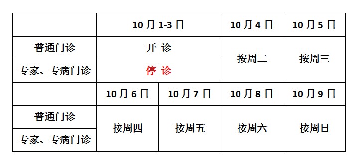 内镜室: 10月1日-10月3日胃肠镜停做(无痛肠镜10月4日-10月5日停做,下午接受预约);