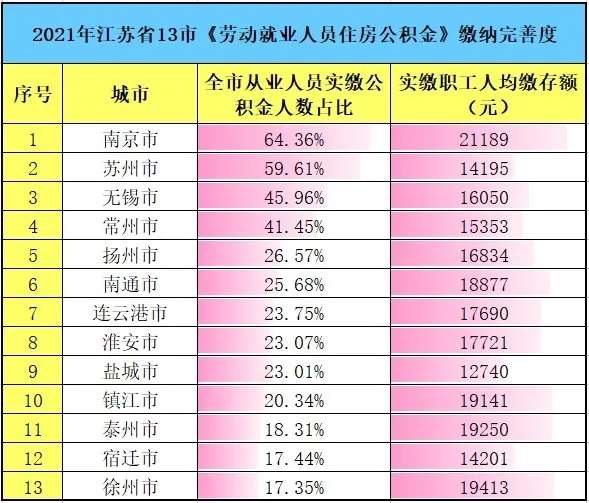 五险一金中的住房公积金缴纳完善度,很能说明一个地方就业规范与吸引力的差别。南京们公教文卫人员规模庞大,吃财政饭的人在苏省遥遥领先。苏州外资台资大本营,工业实力全国前三,大又强。常州上下左右都靠不到,数据难看些也是在意料之中。