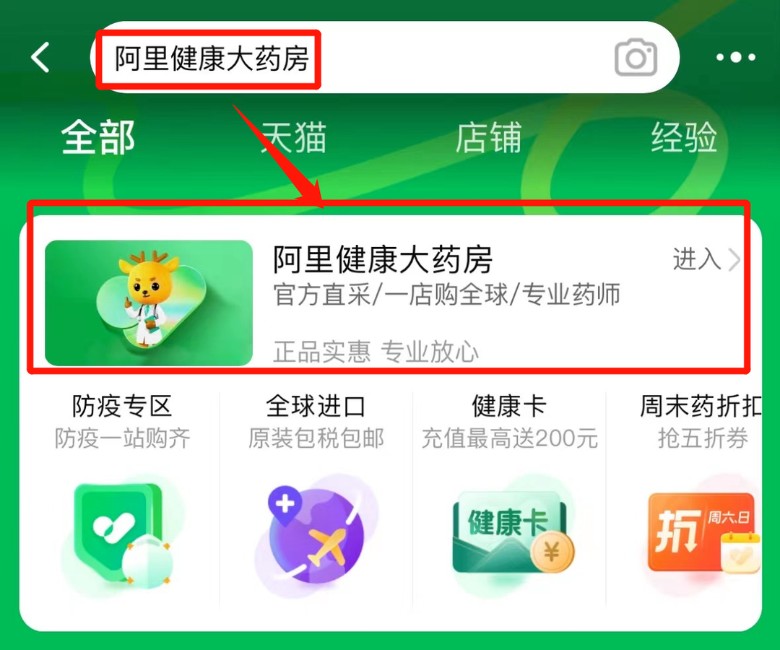 步骤一:在淘宝APP搜索【阿里健康大药房】,进入线上购买入口。