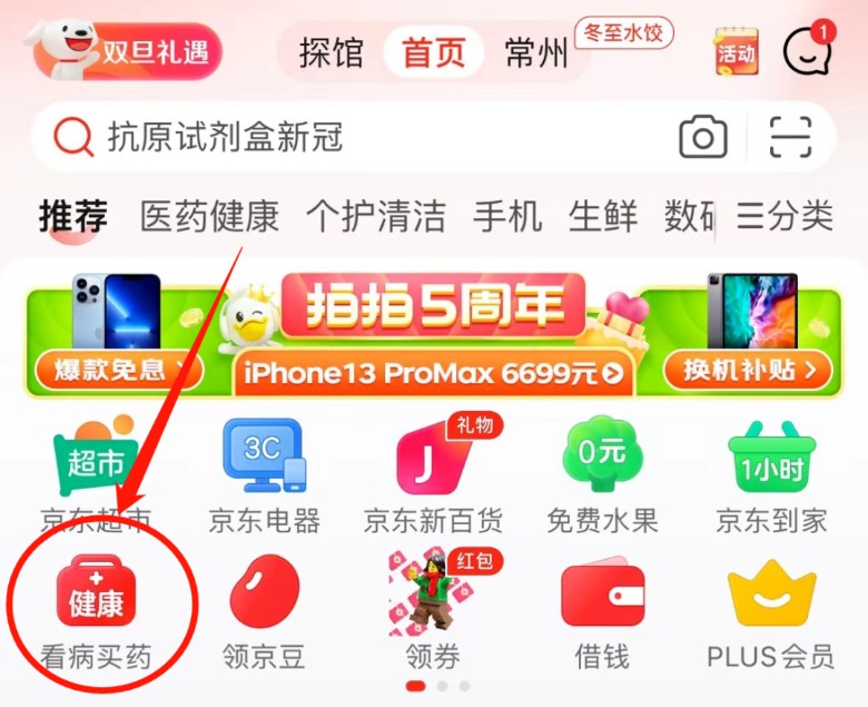 打开京东APP,在首页点击【看病买药】板块(或在搜索框搜索【京东健康】),进入页面后即可查看当日可预约购买药品、具体开抢时间。进入“疫情防护 一站备齐”入口,根据需要选择连花清瘟、退烧药、抗原试剂盒等物资,按时进行预约抢购即可。