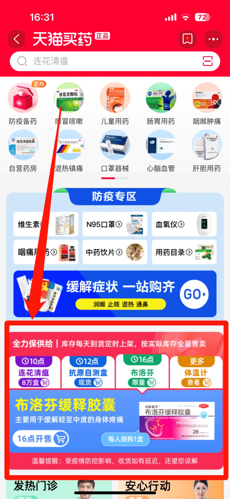 步骤二:进入阿里健康大药房后,选择【防疫专区】,即可查看当日供给药品、开售时间及限购要求。