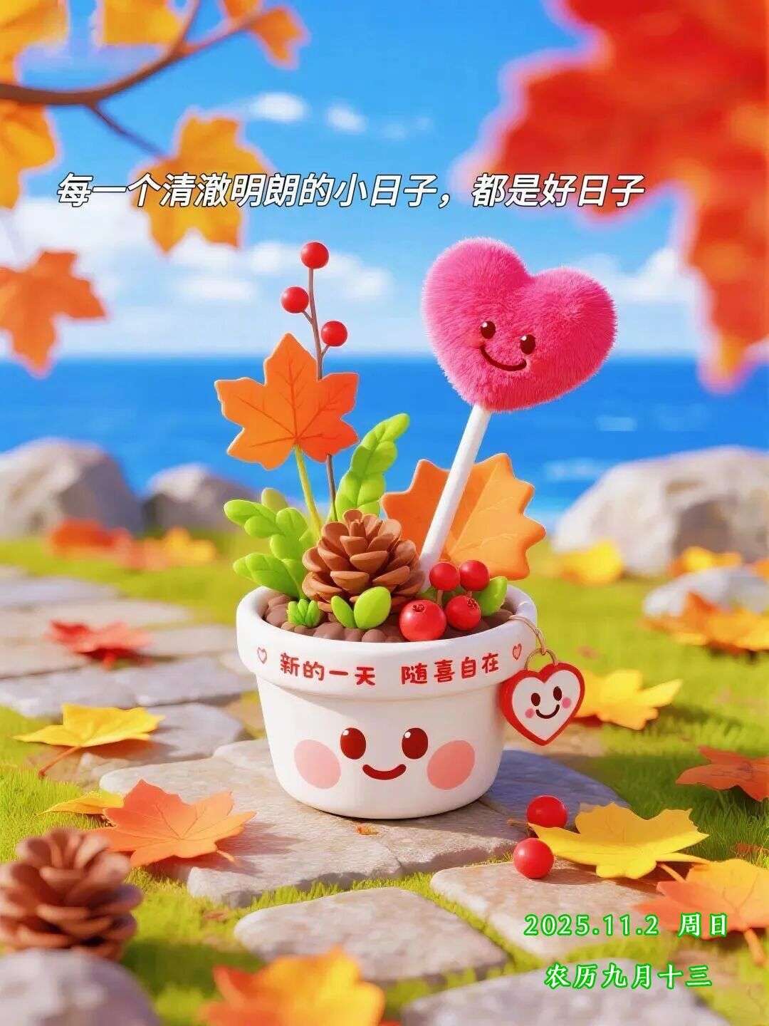 • 许自己一片快乐晴空,保持一颗波澜不惊的心,把握好生活的节奏,用心过好每一天。