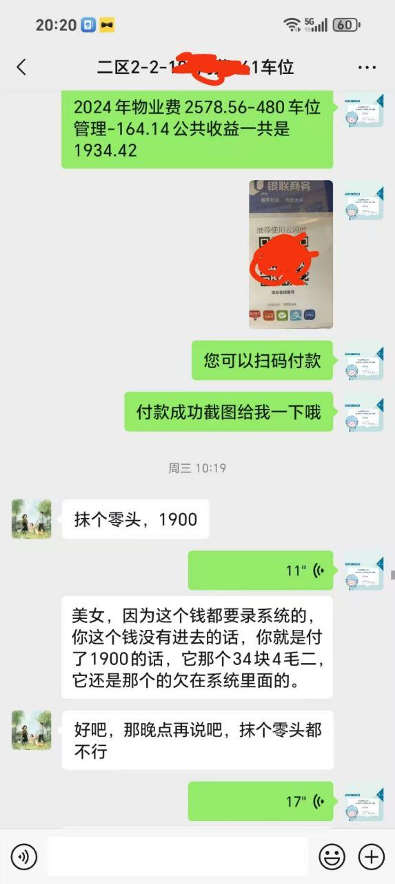 给大家解释一下维权事情起因,催缴24年物业费时,因为23年2月份及24年9月份厨房返水,图1,图2,物业在催我交今年物业费的时候,我心里非常不乐意,本身是想提今年物业费打折的,因为返水问题家里厨房柜子被泡了,很臭,但是物业人员态度比较好(所有后面的聊天记录都有提到,我愿意交物业费是因为她态度好,不是因为物业公司),物业费总归也得交的,我随口说了句抹个零头吧,图3、图4,物业一开始不答应,我心想,我还没叫你打折只是抹个零头这都不行?然后开始犯别扭,再说了物业费交是交了,但是几年的明细一直没看到,我心里犯嘀咕,确实要是能打折我也就不想多麻烦,毕竟是实打实的优惠(大家说我贪便宜也没问题,在溧阳论坛帖子发出来之前,我确实是抱着物业费能打折就算了的心理,多一事不如少一事),但是后来我还是想不明白,我说三年没看到明细,今年刚好又有个公共收益,你让我看一眼明细,只要能看到,零头不抹也无所谓了,才几十块钱,图5,于是就开始跟物业约时间看明细,一开始物业是全程答应的,说材料都是全的,好几本,我就说那就行,我去花15分钟拍完发业主群大家看看,图6。