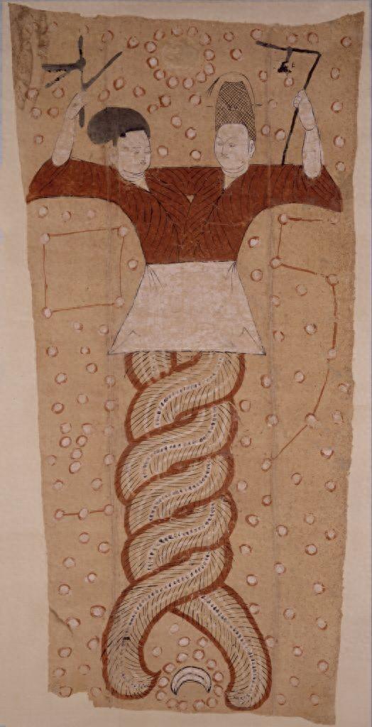 吐鲁番高昌国至唐西州国时期的墓葬出土了许多伏羲、女娲绢画,画面形式大致相似:人首蛇身,交尾相拥,伏羲持矩,女娲持规。绢画上方有日,下方有月,周围布满丝缕相连的星辰。