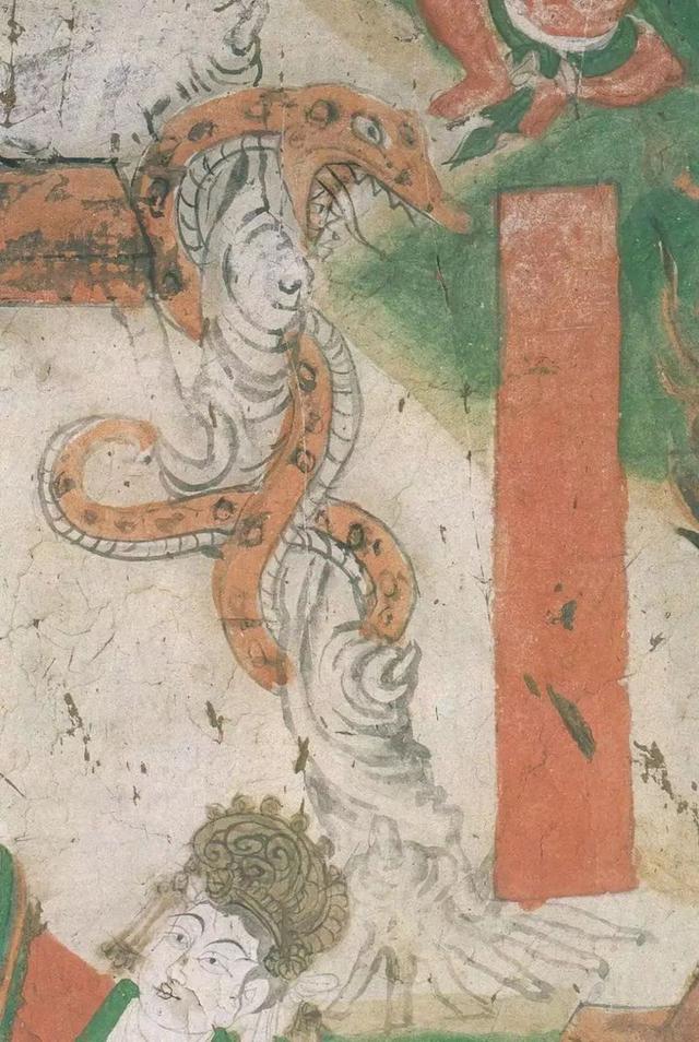 在壁画中,也有蛇的身影。例如,五代榆林窟第16号窟的后室东壁的图像中,一棵根部露出地表而倾斜的大树,被巨大的蟒蛇紧紧缠绕着。描绘细致而又形体较大的蛇。此为劳度叉斗圣变的局部,依据变文中劳度叉化作大树,而舍利弗化作大蛇,“长蛇缠树,大风劲吹,大树根拔而欲倒”这段文字而绘制的。