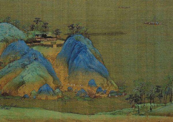 《千里江山图》绢本大 手卷,青绿设色。画面上江水浩荡,浩渺天际,应是南方水色;而群山起伏,略少平原,危峰高耸,岩断崖,却是北方山景。构图上充分运用“平远”、“高远”、 “深远”的结合,展现了大自然的鬼斧神工:崇山峻岭,岗阜幽壑,飞瀑激流,树丛竹林以及人类的创造:亭台水榭,寺观庄院,舟楫亭桥,村落水碾等等,以及难 以计数、各行其是的众人,是那么的繁复而又融洽。12
