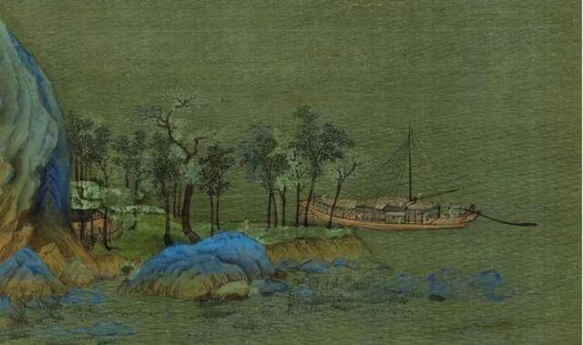 北宋朱长文《吴郡图经续记》中记载:吴江利往桥,庆历八年(1048),县尉王廷坚所建也。东西千余尺,用木万计,萦以修栏,甃以净甓,前临具区,横截松陵,湖光海气,荡漾一色,乃三吴之绝景也。桥成而舟棹免于风波,徒行者晨幕往归,皆为坦道矣。桥有亭,曰垂虹,苏子美曾有诗云:长桥跨空古未有,大亭压浪势亦豪。” 隐藏在山水中的人文情怀。 会玩的宋人来到一汪瀑布之上,凉亭里二人对坐喝茶下棋,好不惬意。游山玩水,饮茶对弈。这是宋代文人的日常:写诗、喝茶、游山。真似东坡所言,独携天上小团月,来试人间第二泉。 籊籊竹竿,以钓于淇。画中有许多表现百姓生活的细节,垂钓就是其中之一。王希孟以写实的手法刻画了宋代垂钓,生动地将千年前的生活实景呈现在了我们眼前,与诗文中的景致无二: 【望江南 江上雪】 李纲江上雪,独立钓渔翁。箬笠但闻冰散响,蓑衣时振玉花空。图画若为工。云水暮,归去远烟中。茅舍竹篱依小屿,缩鳊圆鲫入轻笼。欢笑有儿童。 咫尺有千里之趣,玲珑显诗意万千。除了自然与人文景观之外,在这北宋烟波浩渺的江河、层峦起伏的群山之间,还藏着不少才子佳人诗意中的故事。 【江城子 别徐州】 (苏轼)天涯流落思无穷。既相逢,却匆匆。携手佳人,和泪折残红。为问东风余如许?春纵在,与谁同?隋堤三月水溶溶。背归鸿,去吴中。回首彭城,清泗与淮通。欲寄相思千点泪,流不到,楚江东。 苏仙笔下的离别令人动容,船舶远去,只留岸边青木与佳人独立,流相思千点泪。 【浣溪沙】 王安石百亩中庭半是苔。门前白道水萦回。爱闲能有几人来。小院回廊春寂寂,山桃溪杏两三栽。为谁零落为谁开。 几点白衣少年郎来访,目的地是隐隐在山间的小院,现在这里已没有几个人会来了。就算是最美的春色之中,也显得孤单寂寥。隐士隐世,隐的还有落寞心事。