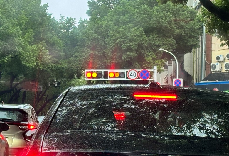 今天可忙坏了交警叔叔,不光要在路口指挥交通,我还看停在路边处理交通事故的警车,就连码头街一个路口的红灯黄灯都终于“奔现成功”见上面了,应该是被雨淋坏了。