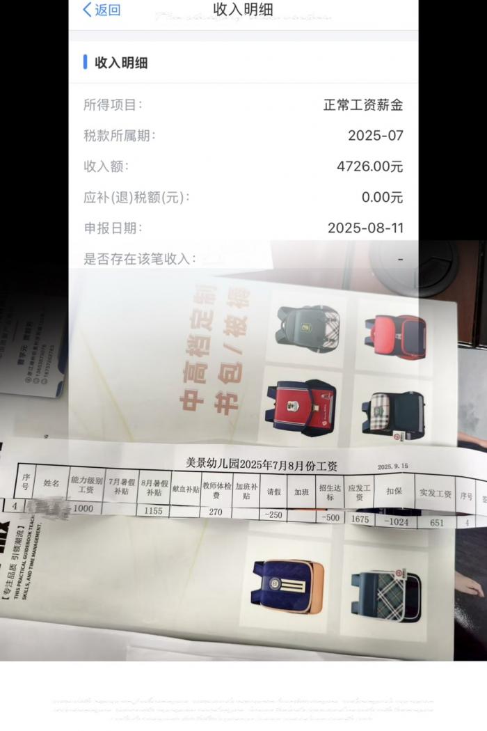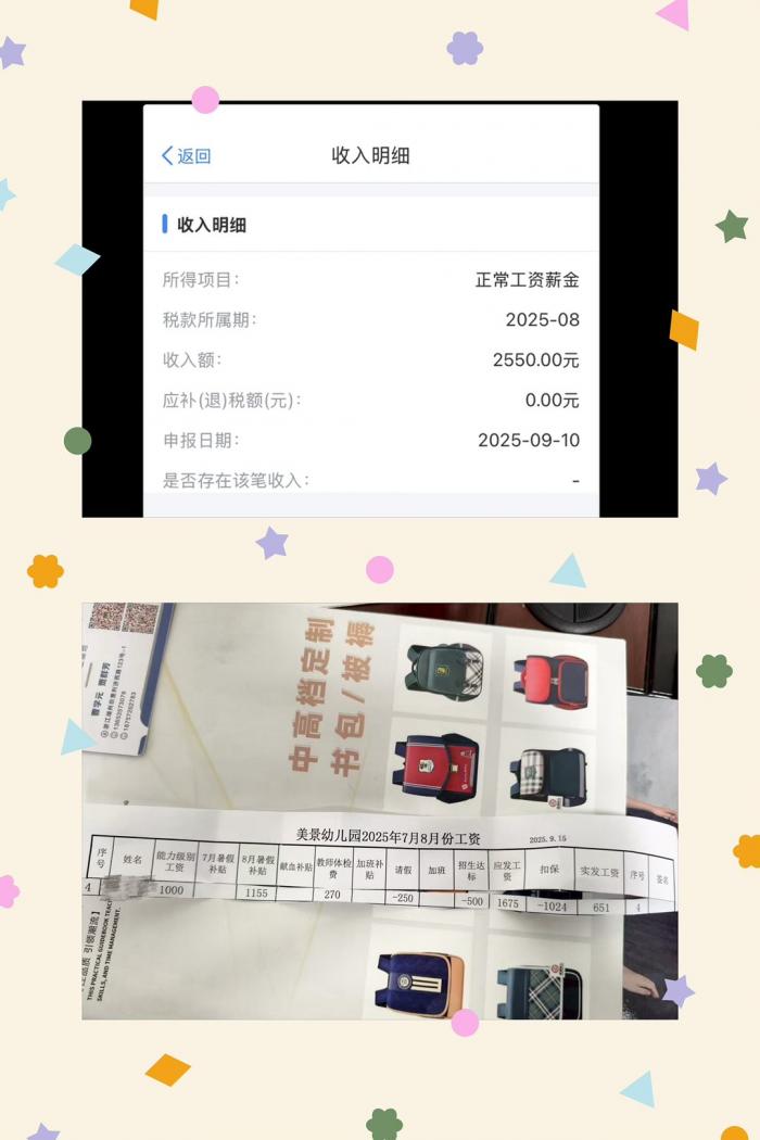 每月个人所得税申报的“收入额”与实际工资(应发工资)存在数百元至千元的显著差异,上述证据足以证明“个税申报金额与实际工资不一致”的事实!这到底是公司算错了,还是有啥我不知道的“隐藏规则”?仅仅暑假两个月就这么离谱大家持续关注,那么过去几年,我在美景幼儿园干了七年,我七年的差价工资去哪里了,幼儿园老师的工资本来就偏低,学校推出了一系列扣钱制度,难道现在咱们打工人都要带钱去学校,做志愿者吗?我暑假付出的近十几天的劳动就换来381?