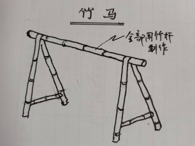 “竹马”的四根脚,是用两根粗细均韵的竹筒在中间加工,形成了“竹马”两头三角形的四条腿,非常扎实,中间一根壮实的毛竹组成了像似的一匹马,故溧阳人叫其“竹马”(见我画的草图)。但“竹马”不同于板凳的木质凳面,竹马的承重面是一根竹筒,横向穿连在两侧竹腿之间,俯视图形成简约的 “工” 字形框架,竹材的坚韧让这骨架承载成人重量也稳当不晃,非常牢固。制作时全凭竹匠的手艺,竹料间多靠榫卯拼接,不用一颗铁钉,和木匠做板凳的技法异曲同工,却更贴合竹材的特性。