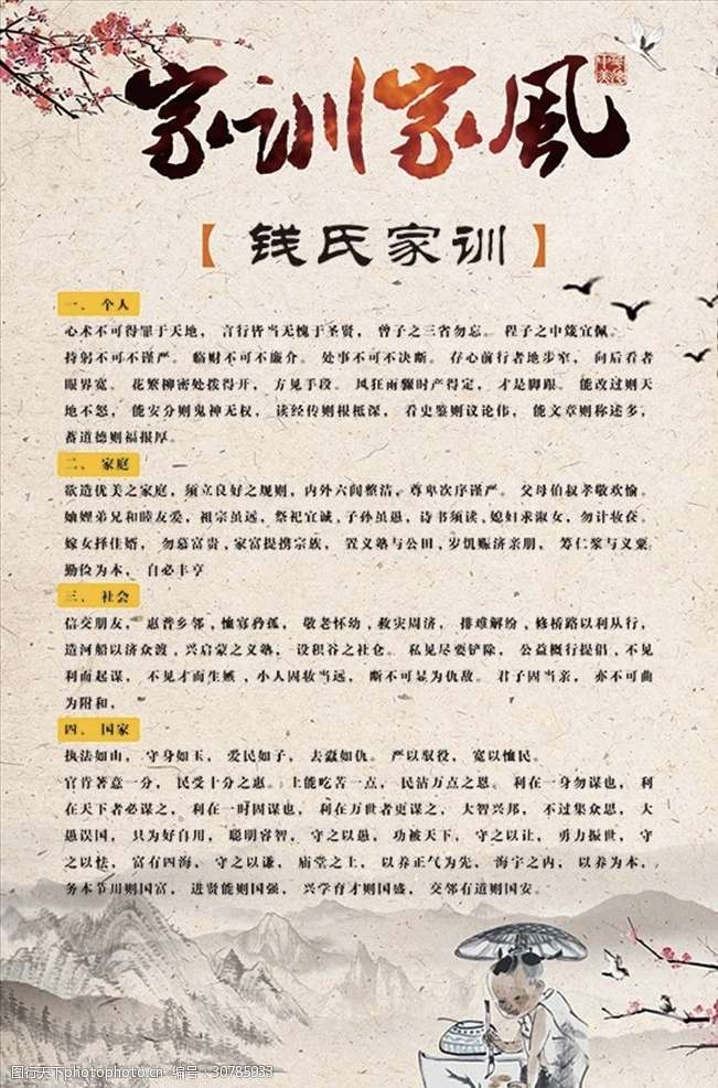 溧阳钱氏不仅根脉绵长,更以传承优良家风为己任,其中最具代表性的便是《钱氏家训》——这部承载着钱氏家族精神内核的典籍,于2021年入选国家级第五批非物质文化遗产扩展项目名录,其形成与完善,始终离不开溧阳钱氏的躬身传承。《钱氏家训》的源头可清晰追溯至吴越钱氏一世祖、武肃王钱镠,他亲立《八训》《遗训》,为家族定下立身、治家、报国的基本准则;其后,忠懿王钱弘俶在先祖训诫的基础上,进一步增辑完善,让家训内涵更趋丰富,得以世代相传。百余年前,溧阳钱氏南山雍肃堂裔孙、两浙盐运使钱文选,在编纂《钱氏家乘》(钱氏宗族族谱汇编)时,广泛搜集钱氏历代训诫,对其进行系统辑录、梳理厘定,最终定稿成文,形成了今日我们所熟知的通行版《钱氏家训》,让千年祖训得以完整留存、广泛传播。这部定稿后的《钱氏家训》,明确分为个人、家庭、社会、国家四篇,条理清晰、字字珠玑,成为历代钱氏子孙立身行事、修身齐家的行为准则。其中,“利在一身勿谋也,利在天下者必谋之”的家国格局,“子孙虽愚,诗书须读”的重教执念,“家富提携宗族,岁饥赈济亲朋”的仁爱初心,早已深深刻入钱氏家族的基因,成为钱氏立族传世、绵延千年的根本所在。溧阳钱氏后裔不仅是《钱氏家训》的辑录者,更是家训精神的忠实践行者。早在明代,溧阳钱氏南山支裔孙钱铎,便始终恪守祖训中的仁爱之道,热心家族公益与乡邻事业:他累计捐出万亩山地和水田,一部分用于兴办钱氏义塾,让家族子弟无论贫富都能读书明礼、传承家风;一部分用于抚养家族中的孤寡老人、接济贫苦宗亲,保障族人基本生计;同时,他还出资修筑当地桥路,方便周边乡亲出行,用实际行动诠释了家训中的仁爱与担当。钱铎的善行义举,不仅赢得了乡邻的广泛赞誉,更得到了朝廷的认可与表彰——明代时,溧阳钱氏因世代践行家训、积德行善,被朝廷正式旌表为“义门”,这份荣誉,既是对溧阳钱氏家风的高度肯定,也让钱氏家训的精神内涵,在实践中得以进一步传承与彰显,成为后世钱氏子孙引以为傲的精神财富。