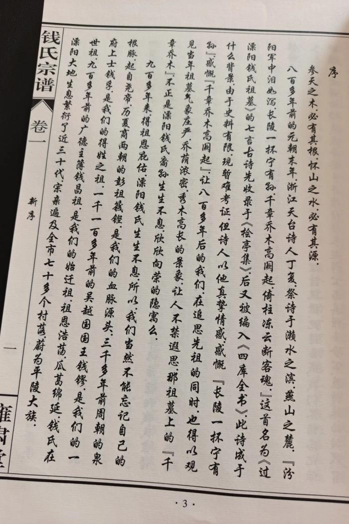 “参天之木,必有其根;怀山之水,必有其源。” 溧阳钱氏为吴越钱氏嫡传分支,源远流长,世系清晰可考。钱昌祖,字炽远,系武肃王钱镠第十世孙、忠懿王钱弘俶第八世孙。南宋年间,他以迪功郎赴广德主簿任上,途经溧阳时,深爱此地民风淳朴、山水秀美,遂下定决心从浙江临海迁居平陵,成为溧阳钱氏的始迁祖。钱昌祖出身名门望族:高祖父钱景臻,受封会稽郡王;高祖母为宋仁宗第十女、秦鲁国贤穆明懿大长公主。靖康之难(1127)后,大长公主阖家随朝廷南渡,宋高宗于绍兴四年(1134)在临海美德坊御赐宅第,定名 “一行宅”,并亲题 “忠孝之家” 匾额。吴越钱氏传世重宝 —— 丹书铁券、三世五王像、五色谱等,均珍藏于此。钱昌祖自幼生长于此,深受祖训家风熏陶,深明忠孝大义。他迁居溧阳时,特意随身携带《吴越钱氏五色谱》,以此铭记先祖根源、不忘根本。自此,钱氏血脉在溧阳大地落地生根、开枝散叶。元代诗人丁复在其《桧亭集》(收录于《四库全书》)中,作《过溧阳钱氏祖墓》一诗,写道:“千章乔木高阙起,倚柱冻云断客魂”,既赞叹墓园气势庄严,也喻示着钱氏家族世代兴旺、福泽绵长。历经八百多年薪火相传,溧阳钱氏支派兴盛,主要有南门锦林堂、南山雍肃堂、古县报本堂等,后裔子孙遍布溧阳七十多个村落,其中天目湖吴村更是钱氏后人聚居最集中的地方。自明清以来,各支派始终严守祖训、持续修撰族谱,虽历经世事变迁、岁月风雨,依旧家风长存、根脉不断,忠恕传家、诗书继世的优良传统,在今日更加彰显。