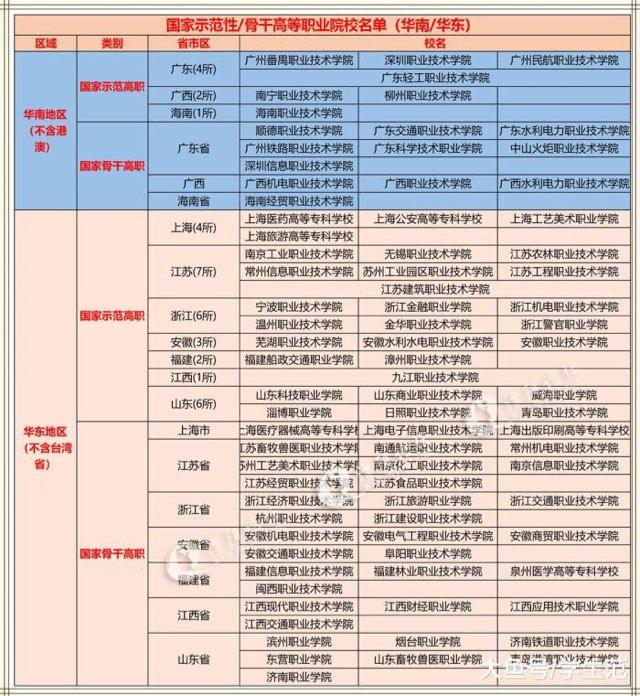 上图是华南及华东地区的入选高校名单,经济及地理位置的优势在这个表中得到很好的体现,江苏15所高职在榜,浙江和广东都有11所高职在榜。值得一提的是深圳职业技术学院是国内公认的高职第一,而浙江的金华职业技术学院、浙江金融职业技术学院、宁波职业技术学院在国内也是极为知名的。