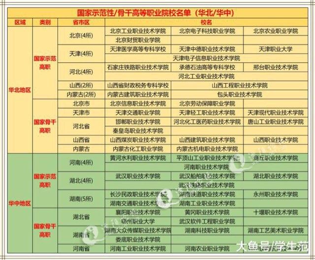 国家示范高职要求的是每所高校全面均衡发展,没有明显短板。而作为补充的国家骨干高职,要求相对低点,只要求某个学科或者某个领域拔尖,继而促进该校全面发展。上图是华北和华中地区的入选高职明档数量,作为高等教育集中的北京、天津、湖南及湖北,高职发展也相当不错,比如北京电子科技学院、武汉职业技术学院、长沙民政职业技术学院、天津职业大学等都是高职当中靠前的存在。