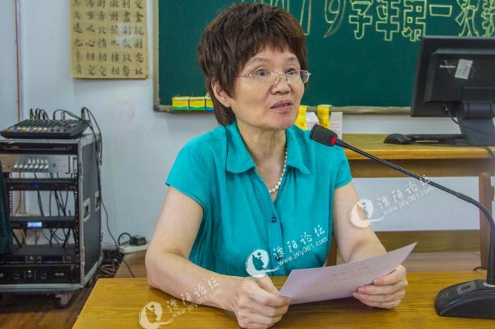 附严丽华老师在教师班长联席会议上发言时的照片一张,摄影:胡盘金
