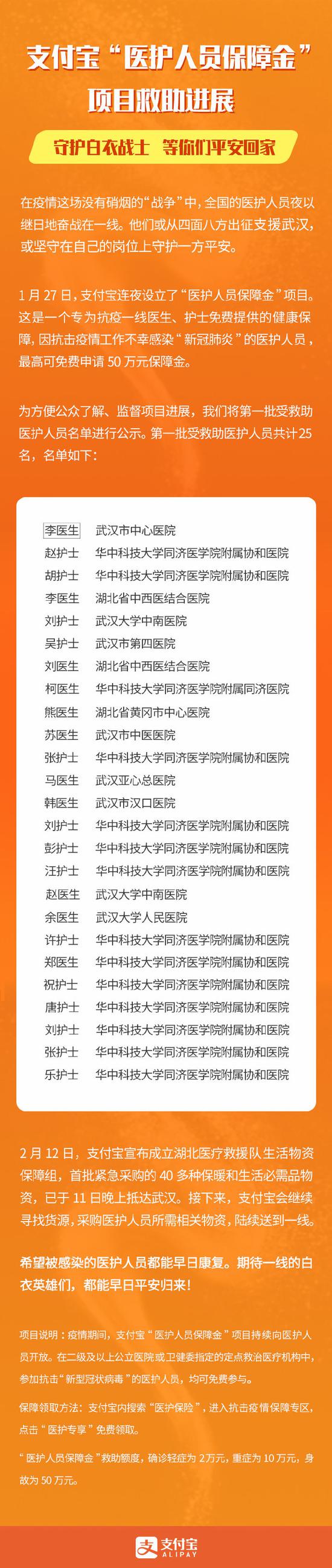 支付宝披露“医护人员保障金”项目进展:第一批救助25位医生护士