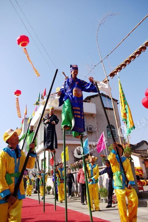 高跷的表演程序一般是:首先是“开场”“搭象”,即以叠罗汉的形式走出场,然后由头跷、二跷带领。两人一对跑“大场”。大场跑完,舞队中最后一对称“压鼓”的演员留在场上表演一段,下接“清场”即小场,几对清场之后,最后还要演出一些“小 放牛”等小戏。另外,还有配合锣鼓、乐队的,这时渲染场子的气氛起着重要作用。场上的每段表演十分自由,演员可即兴发挥,创造出许多新颖的形式。如其中清场的男女对舞别具特色,一般有上装(女角)和下装(男角)两人,上装手持手帕、扇子作舞,下装带水袖,尤其是手帕的耍舞,花样繁多。在表演上,高跷艺人讲求做到“稳中浪”,“浪”是舞得“活”、舞得“俏”的意思,就是要在稳的基础上,舞得活而美,浪而俏。高跷主要是在灯节、庙会时演出,各路高跷队也走村串户,拜年贺喜,若两支高跷队队伍相缝时,还各显身手,作一番竞技性的表演。