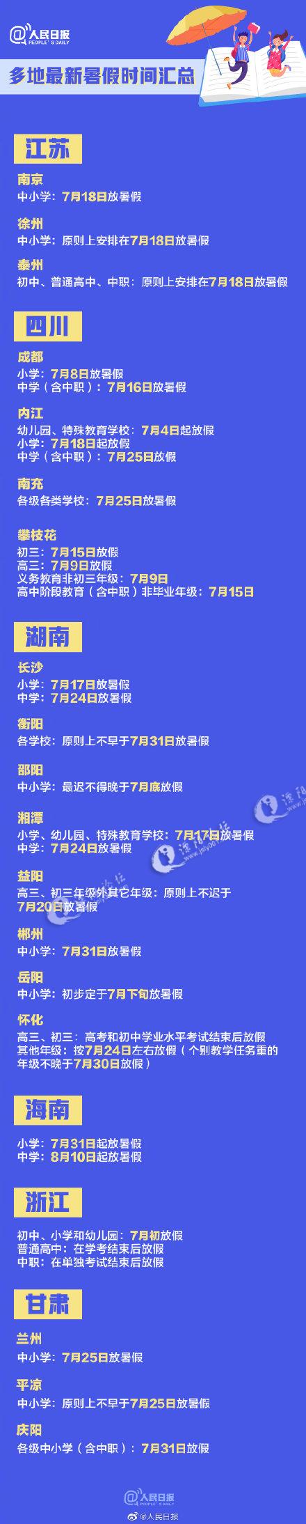 ①浙江:初中、小学、幼儿园7月初放假;②海南:小学7月31日放假,中学8月10日放假;③四川成都:小学7月8日放假,中学7月16日放假;④江苏南京:中小学7月18日放假;⑤湖南长沙:小学7月17日放假,中学7月24日放假。⑥甘肃兰州:中小学7月25日放假。更多↓ ​