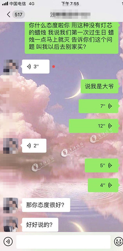 我儿子过周买了一个蛋糕,蜡烛总共就一根,一点就灭,我一看压根没有灯芯,发微信问他这个蜡烛怎么质量这么差,别人过周蜡烛一点就灭肯定心里不舒服,我本来就是看他一个态度,这个店主说蜡烛有问题去找卖蜡烛的关他什么事,说我是大爷,以后别来他们家买蛋糕了,哪里蜡烛质量好去哪里买,给我气的!好好地一个生日,还是第一次过生日遇到这种事,动物奶油只有薄薄的一层,动奶糖都没加,根本没味道,一言难尽。