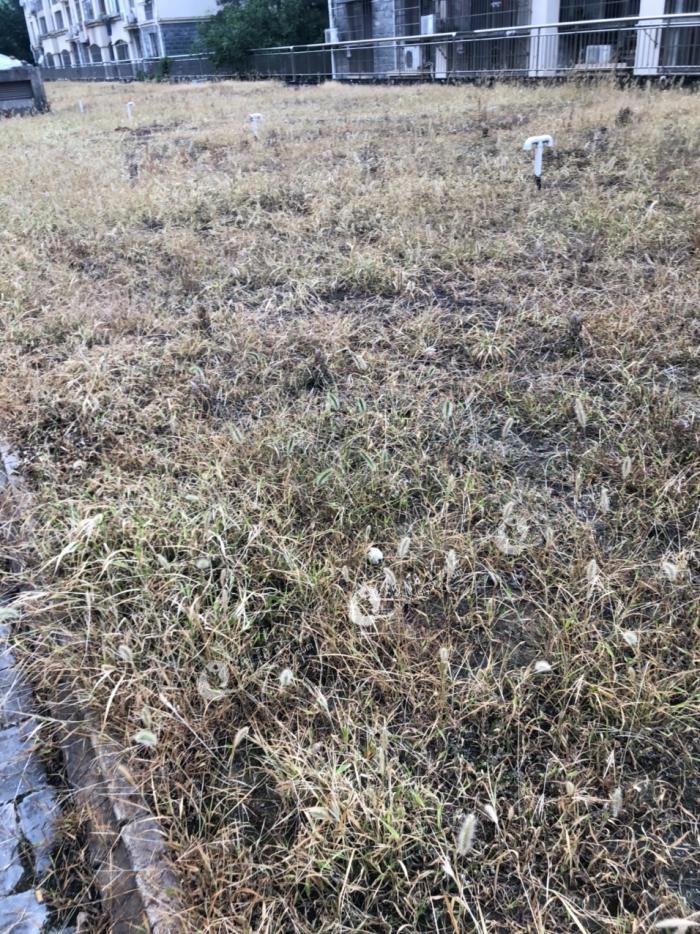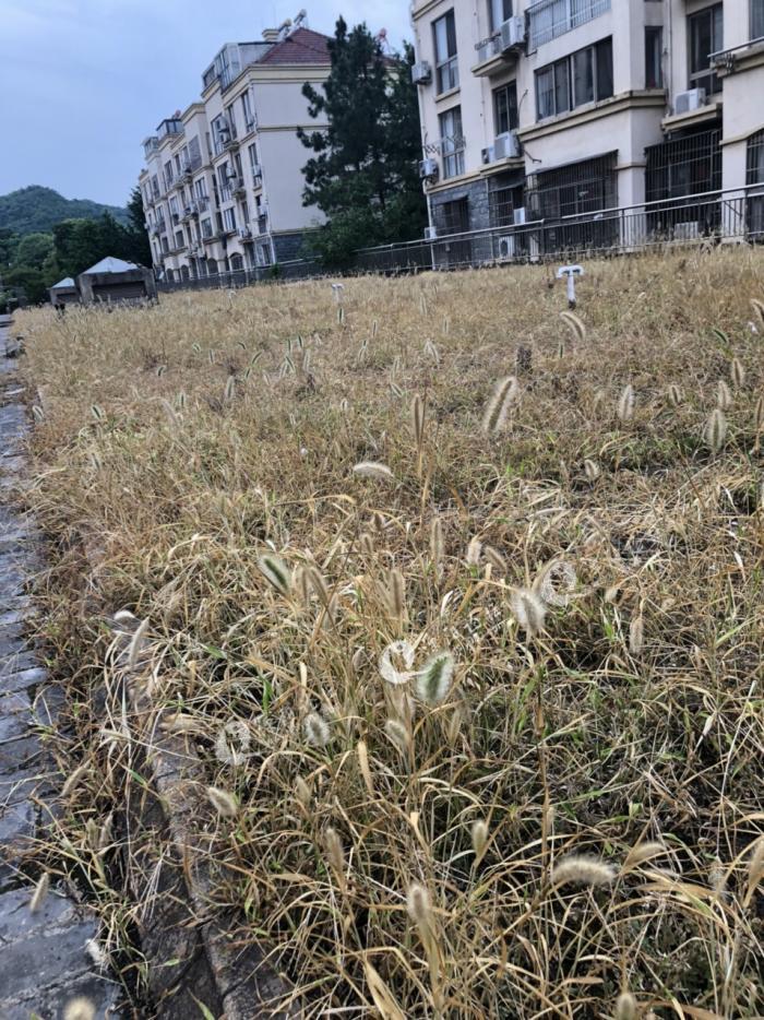 这是龙泉山庄的物业所为,这片空地,不植树不种草,杂草长出后怎么办?打除草剂!除草剂是一种毒性较强的化学物质,其残留成分可能会流入土壤污染环境,不知道物业这样做有没有考虑过生态环境保护的问题!