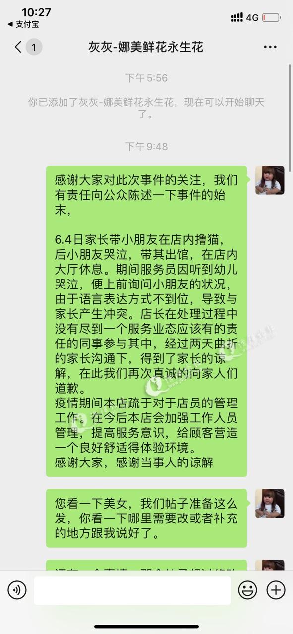 6.4日家长带小朋友在店内撸猫,后小朋友哭泣,带其出馆,在店内大厅休息。期间服务员因听到幼儿哭泣,便上前询问小朋友的状况,由于语言表达方式不到位,导致与家长产生冲突。店长在处理过程中没有尽到一个服务业态应该有的责任的同事参与其中,经过和家长沟通下,得到了家长的谅解,在此我们再次真诚的向家人们道歉。