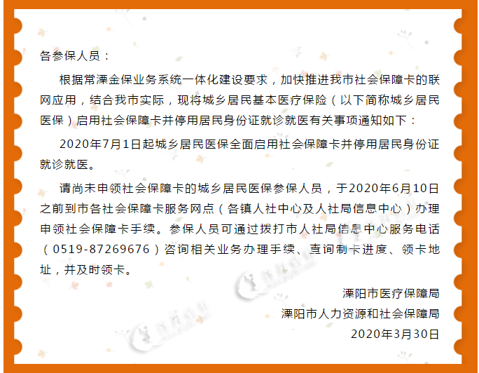 2020年7月1日起,城乡居民医保全面启用社会保障卡,并停用居民身份证就诊就医。