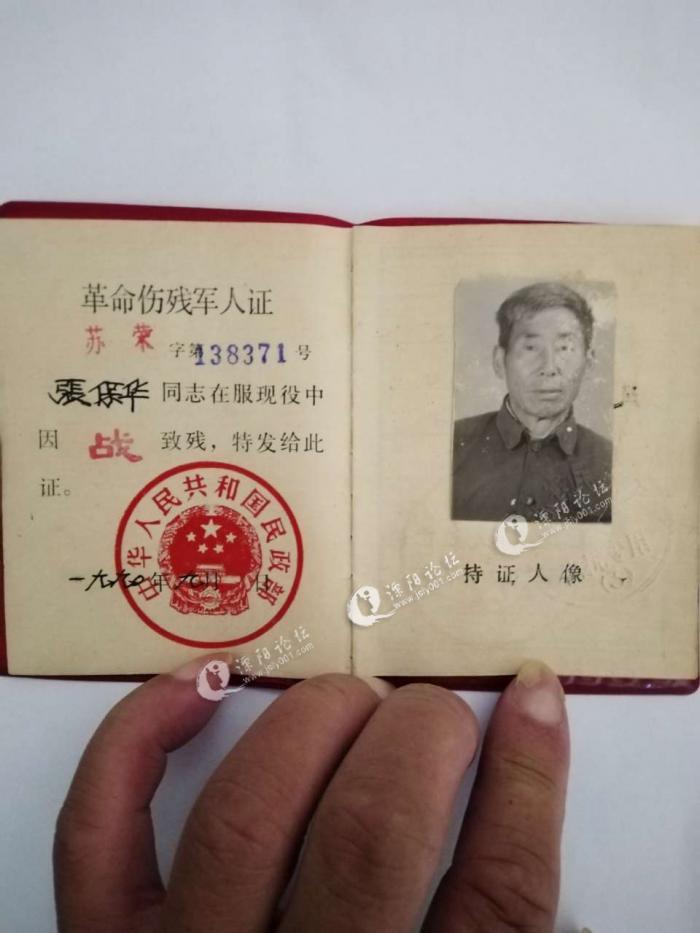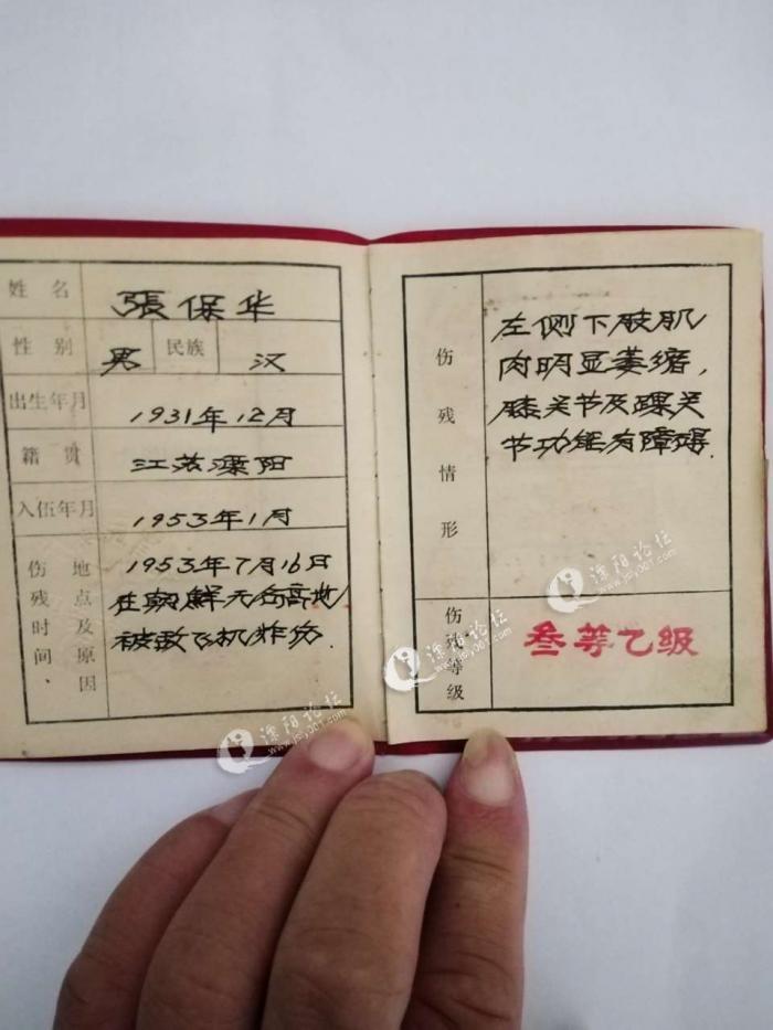 就是在这场金城反击战中,张保华在1953年7月16日的战斗中,在朝鲜的一个无名高地,被敌人的飞机扔下的炸弹炸伤,《残废证》上记录他的受伤情况是:左侧下肢肌肉明显萎缩,膝关节及踝关节功能障碍,有关部门评定为:战伤,叁等乙级伤残。