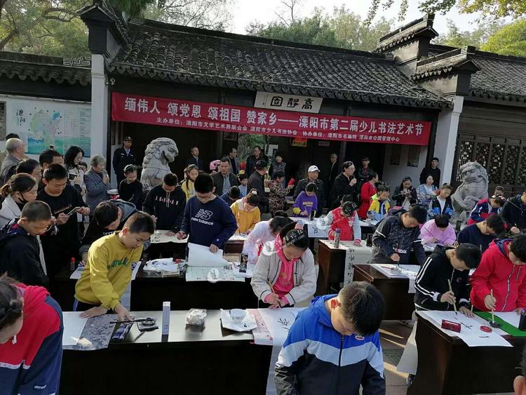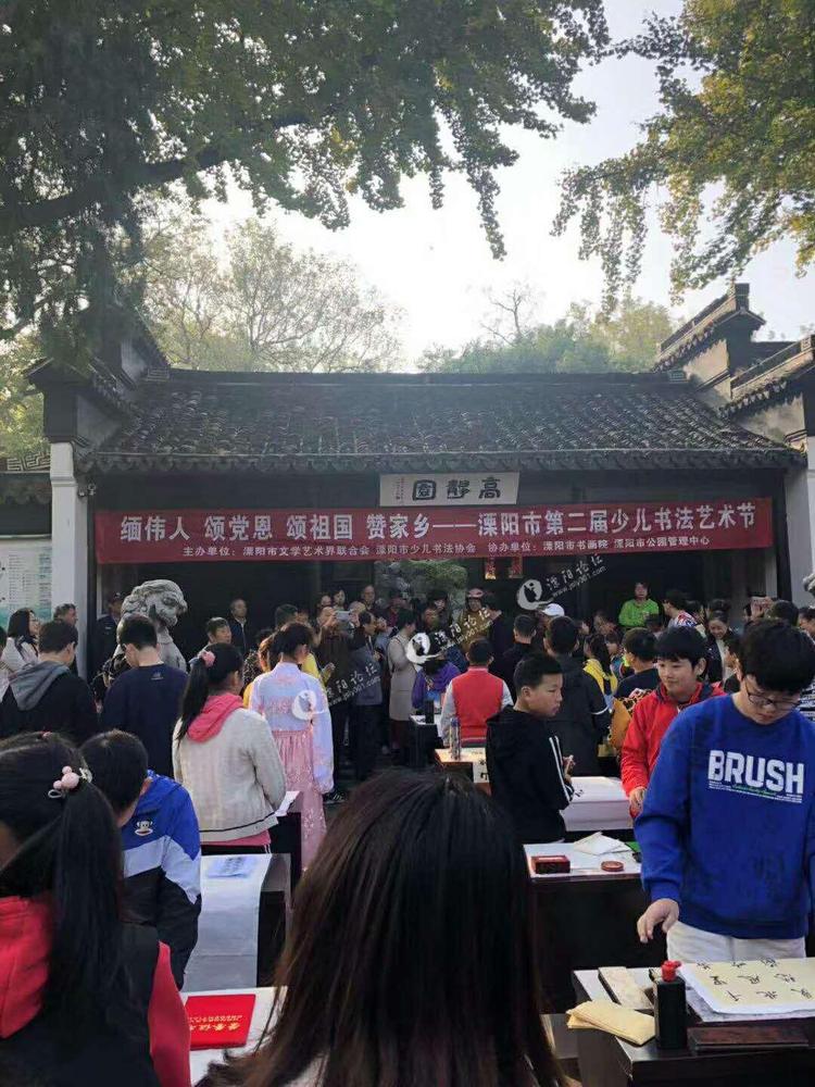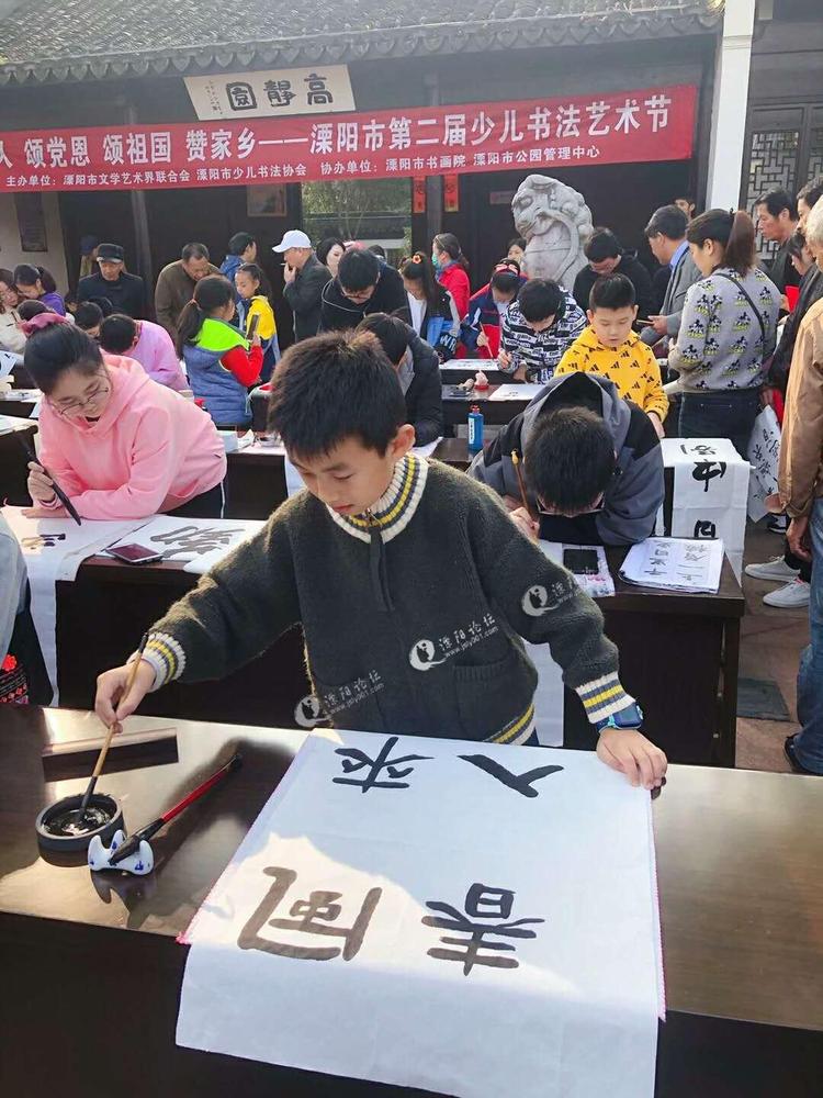 众所周知,受历史的影响和熏陶,溧阳的少儿书法活动频繁,队伍庞大。小学生、中学生二、三万人在习书练字。溧阳少儿书法人才辈出,成果斐然,少儿书法有近千件作品出国展览或被收藏,为溧阳争得声誉。1997年,溧阳被江苏省文化厅命名为"江苏省民间艺术之乡"(少儿书法)。2000年,在溧阳撤县设市十周年之际,溧阳被国家文化部命名为"中国民间特色艺术之乡"(少儿书法)。 最近,由溧阳市文学艺术界联合会,溧阳市少儿书法协会共同主办,溧阳市书画院,溧阳市公园管理中心协办的“缅伟人,颂党恩,颂祖国,赞家乡”第二届溧阳市少儿书法艺术节将于11月15日一23日在高静园太白楼(一层二层)及书画院办公室举行。本次艺术节共分两个内容:,首先,本月 15日(今天)上午在高静园大门广场的少儿书法现场表演。其二, 书法展览 。 本次共展出少儿书法作品166件。展期9天。欢迎社会各界朋友光临指导。