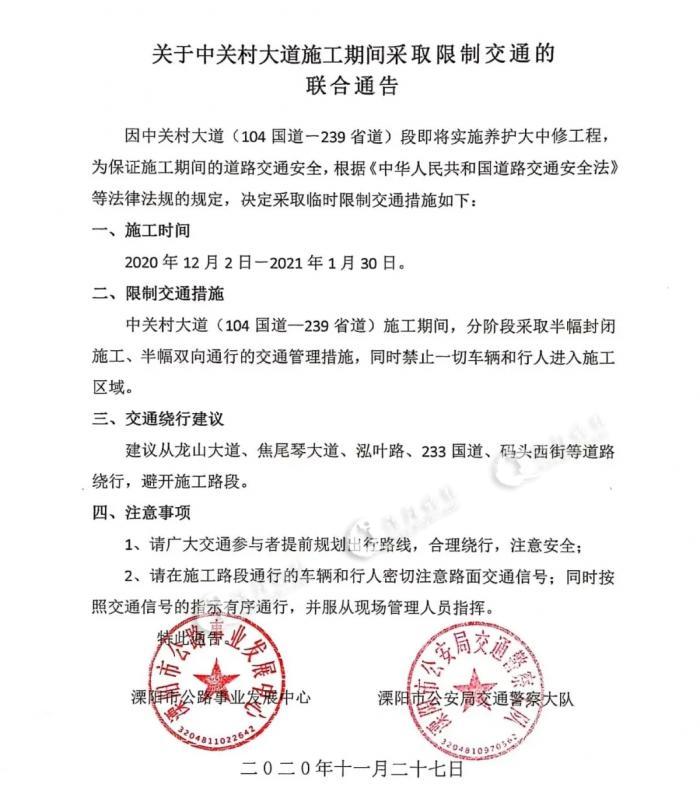 (公告)关于中关村大道施工期间采取限制交通的联合公告