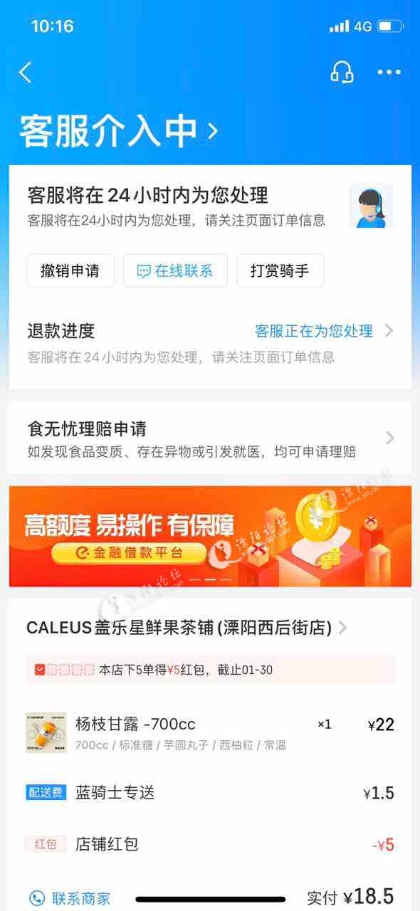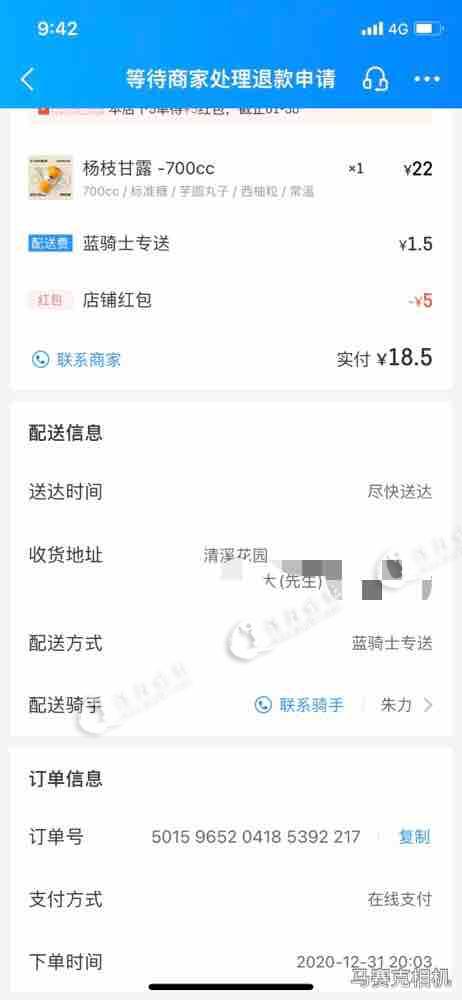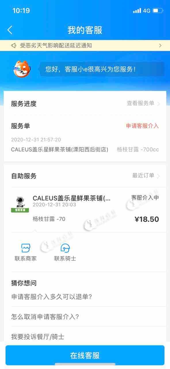晚上8.03分在饿了么的盖乐星点了杯奶茶,送达时间为晚上的9.02。直到9点半我还没等到,先是打电话给骑士,骑士关机联系不上了,在打电话给商家可能比较忙一连打了3.4个电话才通,直接让我投诉骑士。我申请退款也不让,现在再次申请了退款正好赶上商家下班,没人理了。大家上班都很辛苦也能理解,想想也是倒霉,2020的最后一天晚上钱花了,奶茶没喝到气倒是气饱了。