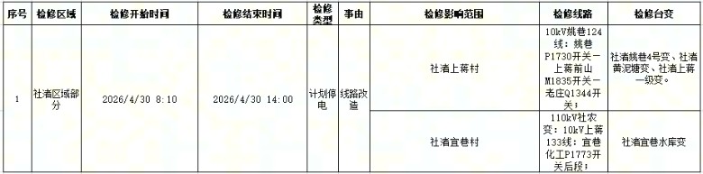 尊敬的客户,检修期间供电将会暂时中断,由此带来的不便,敬请谅解,本区域电网检修信息如下: